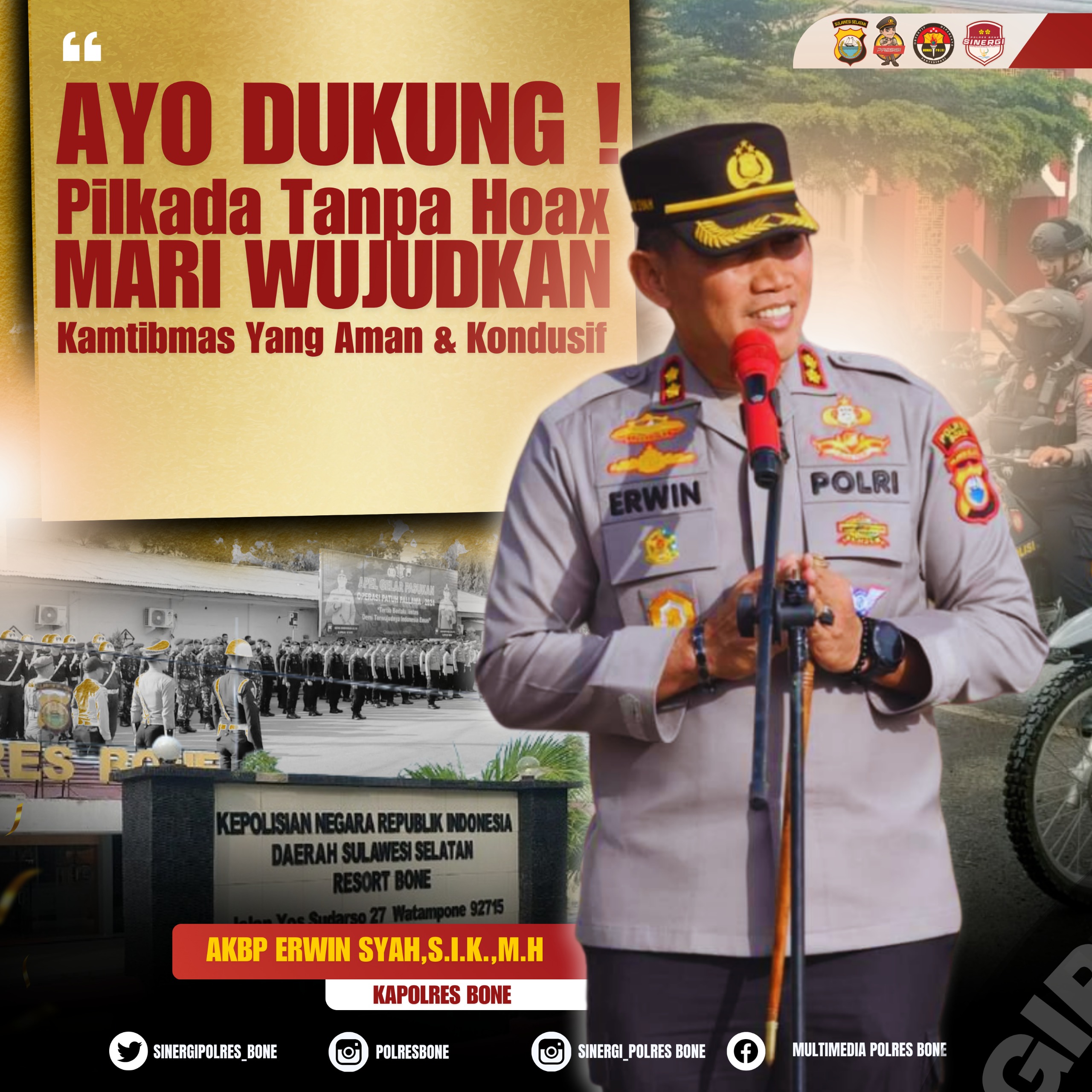 Kapolres Bone AKBP Erwin Syah, S.I.K.M.H mengatakan bahwa, untuk menciptakan Pilkada Aman dan damai tanpa hoax, isu sara dan politik identitas, Polres Bone membutuhkan kerjasama seluruh masyarakat.