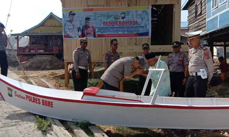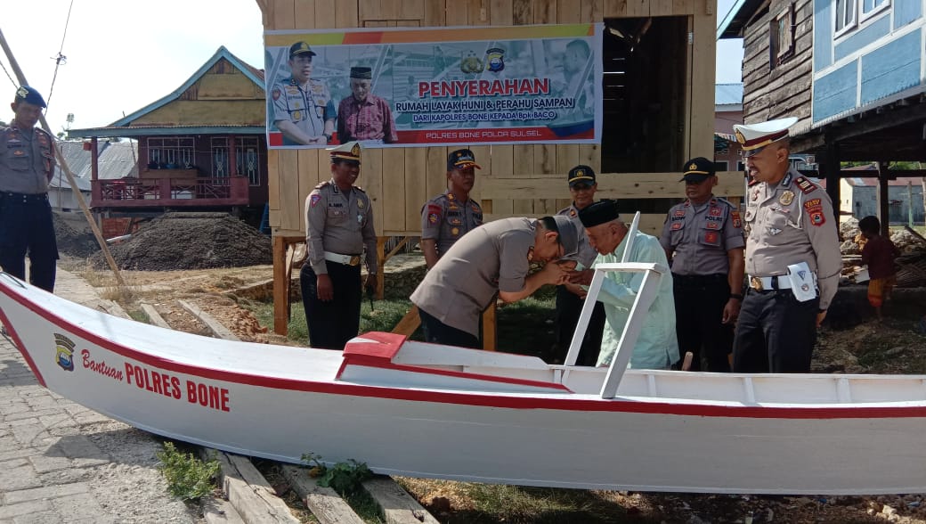 Kapolres Bone Serahkan Bantuan perahu kepada Kakek Baco