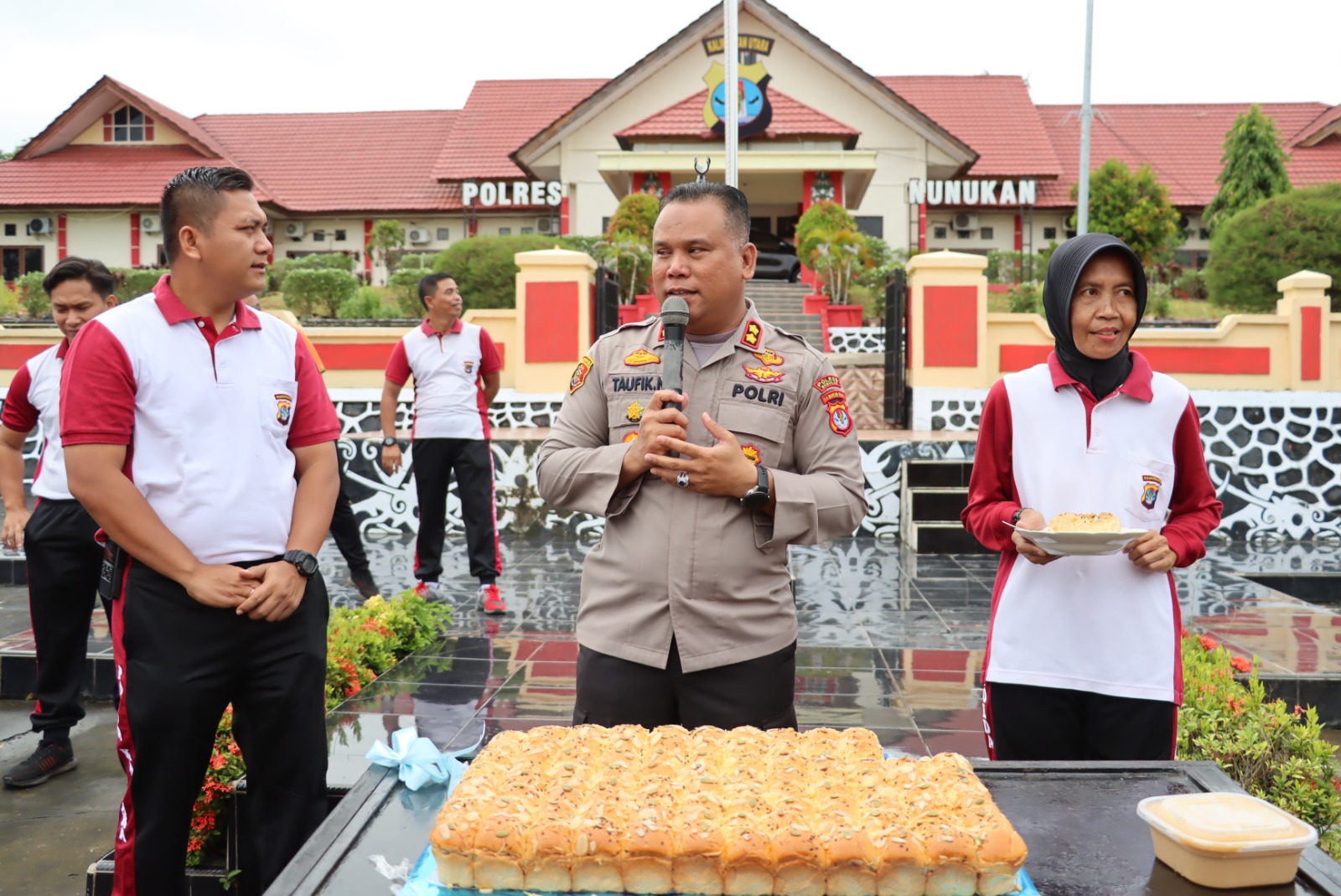 Usai melaksanakan olahraga pagi, Kapolres Nunukan didampingi Wakapolres Kompol William Wilman Sitorus, S.I.K., M.H beserta PJU Polres Nunukan langsung turun kelapangan Apel Tribrata, untuk memberikan kejutan kepada Polwan Polres Nunukan.