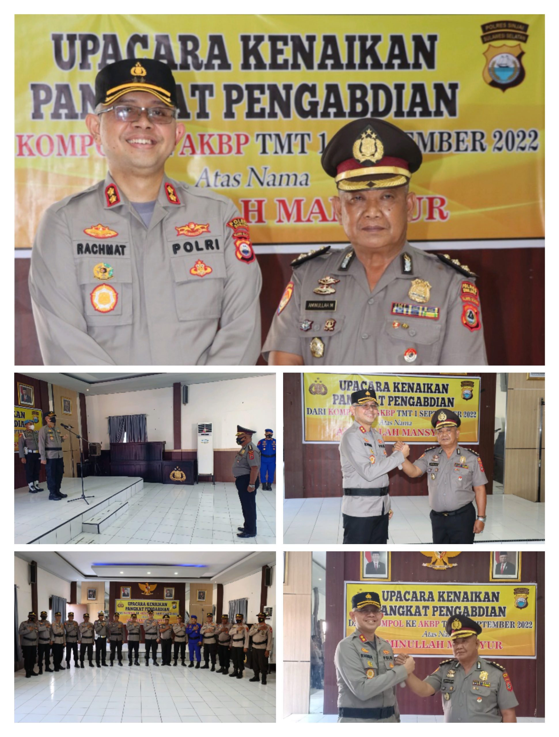 Adapun personel Polres Sinjai yang naik pangkat pengabdian atas nama Aminullah Mansyur dari pangkat yang semula yakni Komisaris Polisi (Kompol) menjadi Ajun Komisaris Besar Polisi (Akbp) TMT 1 September 2022.