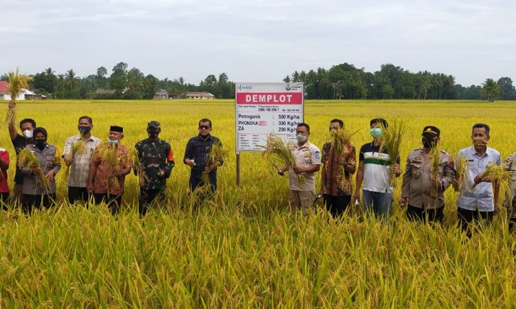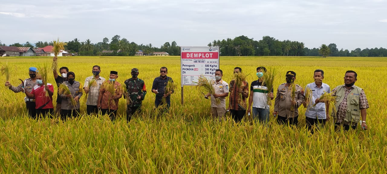 Panen perdana ditandai dengan pemotongan padi secara simbolis oleh Kadis Ketahanan Pangan Hortikultura Dan Perkebunan bersama Tripika dan para undangan yang hadir dan dilanjutkan dengan penilaian dari Tim Demplot Mandiri Padi.