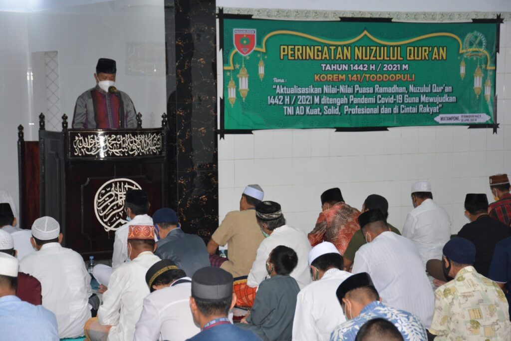 Watampone – Berandankrinews.com Kasrem 141/Toddopuli. Kolonel Inf Heri Purwanto S.E menghadiri kegiatan Peringatan Malam Nuzulul Qur’an dengan tema “Aktualisasikan Nilai-Nilai Puasa Ramadhan, Nuzulul Qur’an 1442 H/2021 M di tengah Pandemi Covid-19 Guna Mewujudkan TNI-AD Kuat, Solid, Profesional dan di Cintai Rakyat” Di Masjid Al-Istiqomah Korem 141/Tp Jl. Jendral Sudirman, Kab.Bone.