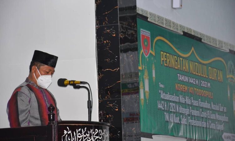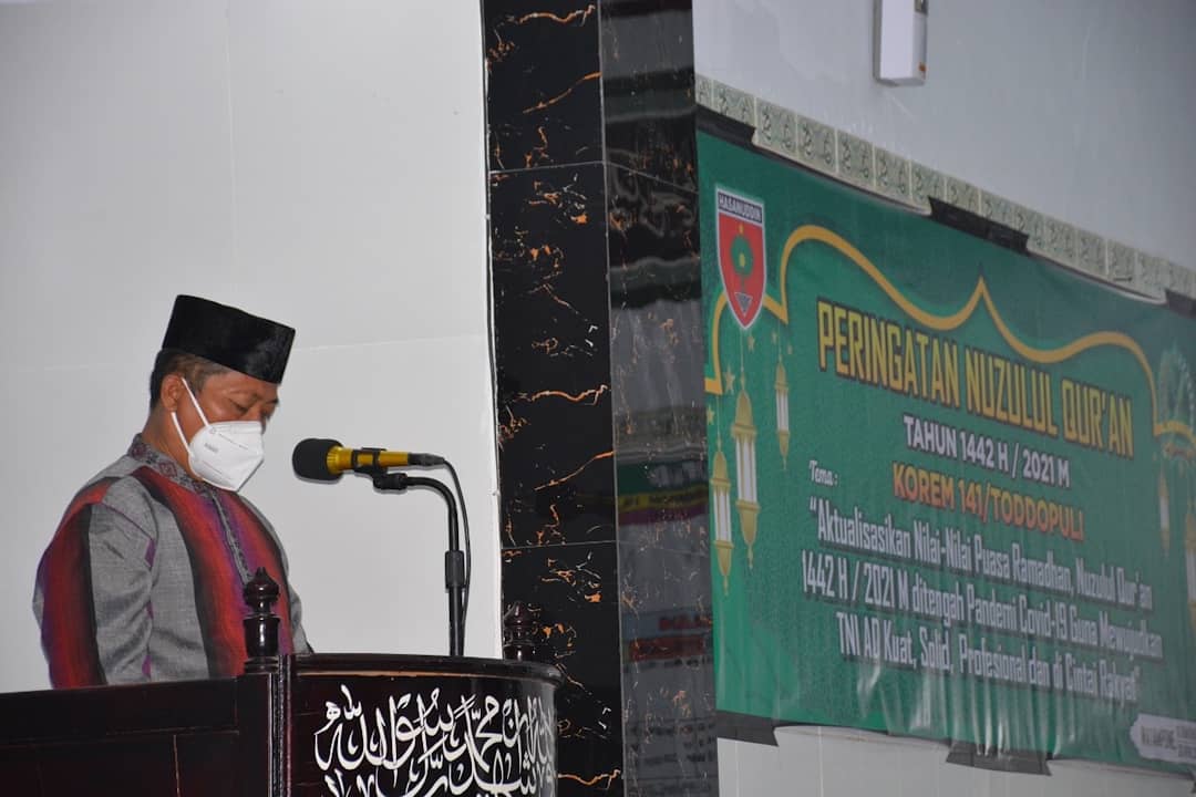 Adapun sambutan Danrem 141/Tp yang di bacakan Oleh Kasrem 141/Tp Kolonel Inf Heri Purwanto, S.E yang intinya, Nuzulul Qur’an atau turunnya ayat-ayat Suci Al-Qur’an merupakan peristiwa besar yang mempunyai makna penting bagi kehidupan umat Islam.