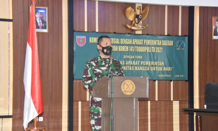 Watampone -Berandankrinews.com. Telah dilaksanakan Komunikasi Sosial dengan Aparat Pemerintahan Daerah di Wilayah Korem 141/Toddopuli TA. 2021 dengan tema “Sinegritas Aparat Pemerintah Membangun Imunitas Bangsa untuk NKRI” Dibuka oleh Kasrem 141/Toddopuli. Kolonel Inf Heri Purwanto, S.E. Di Aula Sudirman Makorem 141/Toddopuli Jl. Jenderal Sudirman. Kab. Bone. Jumat 25/06/2021.