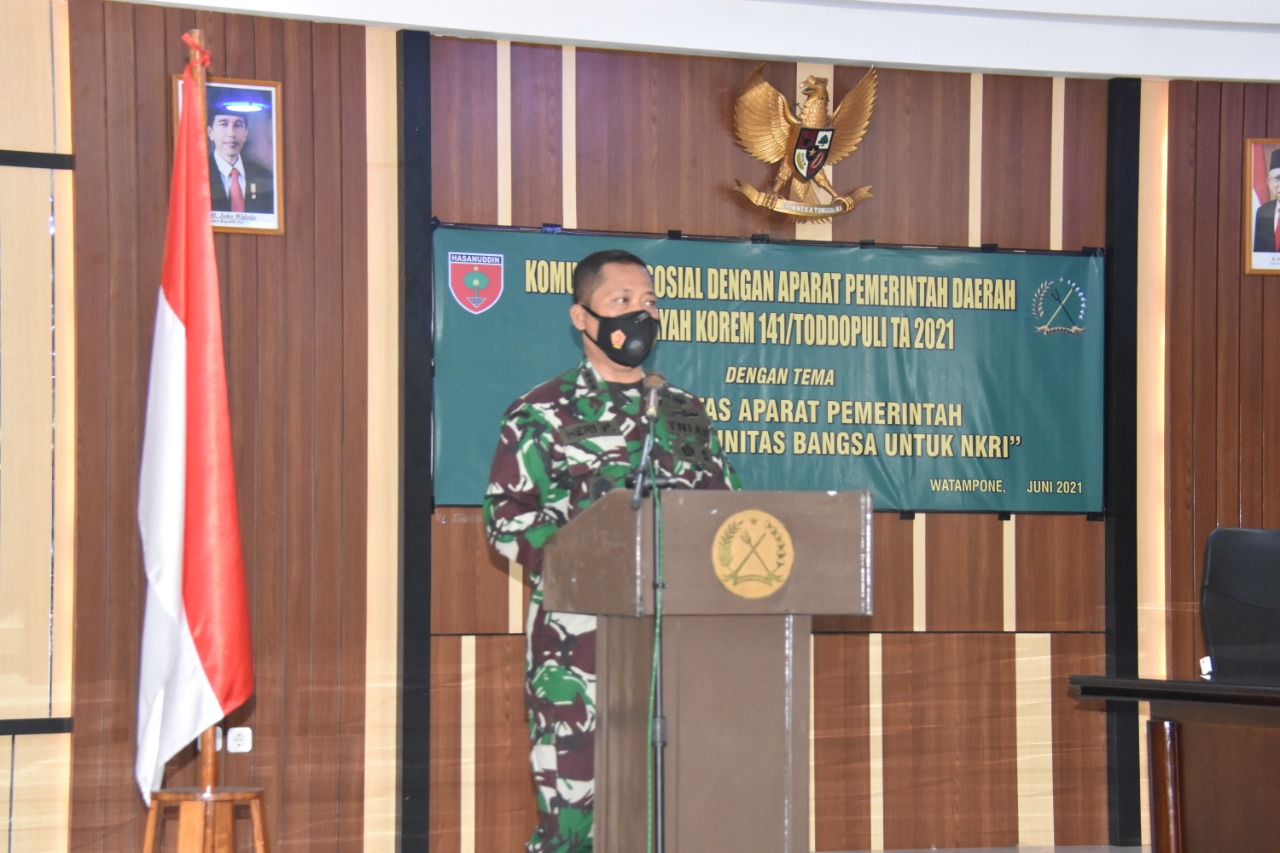 Sambutan Danrem 141/Toddopuli yang dibacakan oleh Kasrem 141/Tp Kolonel Inf Heri Purwanto, S.E yang intinya Komunikasi Sosial ini merupakan wadah untuk meningkatkan kerja sama yang semakin erat antara Korem 141/Toddopuli dengan Aparat Pemerintah Daerah, sehingga tercapai pemahaman tentang empat pilar (Pancasila, UUD 45, NKRI, Bhinneka Tunggal Ika) sebagai konsensus dasar kehidupan berbangsa dan bernegara dalam menghadapi berbagai permasalahan yang timbul dalam kehidupan masyarakat. “Ungkapnya.