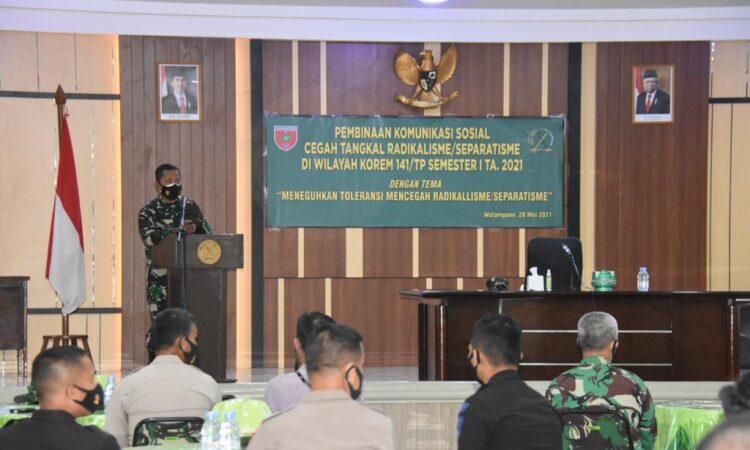 Telah dilaksanakan Pembinaan Komunikasi Sosial Cegah Tangkal Radikalisme/Separatisme di Wilayah Korem 141/Toddopuli, Semester I Ta.2021 Dengan Tema “Meneguhkan Toleransi mencegah Radikalisme /Separatisme” yang dibuka oleh Kasrem 141/Toddopuli. Kolonel Inf Heri Purwanto,S.E. di Aula Sudirman Korem 141/Tp Jl.Jenderal Sudirman No.9 Watampone dengan tetap mengikuti Protokol Kesehatan memakai Masker,Jaga Jarak serta mencuci tangan. 28/05/2021.