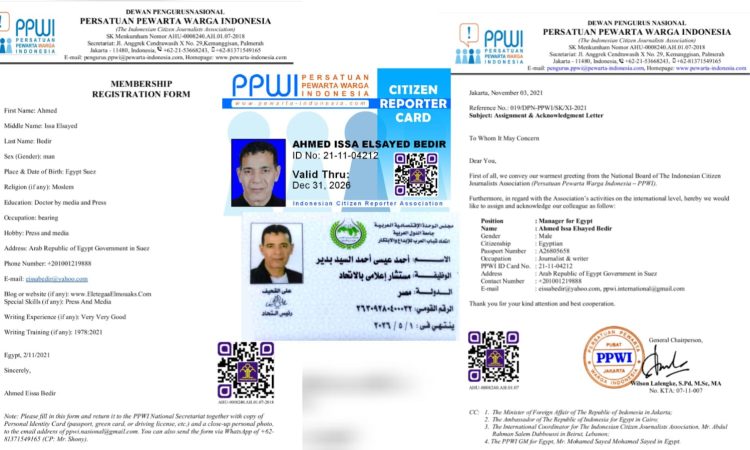 Dalam langkah strategis memperkuat jejaring internasionalnya, Persatuan Pewarta Warga Indonesia (PPWI) resmi menetapkan Ahmed Issa Elsayed Bedir sebagai Manajer PPWI untuk Mesir. Penunjukan ini tertuang dalam Surat Penugasan dan Pengakuan No. 019/DPN-PPWI/SK/XI-2021 yang ditandatangani langsung oleh Ketua Umum PPWI, Wilson Lalengke, S.Pd, M.Sc, M.A.