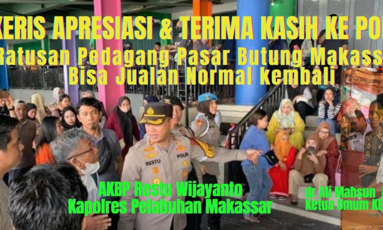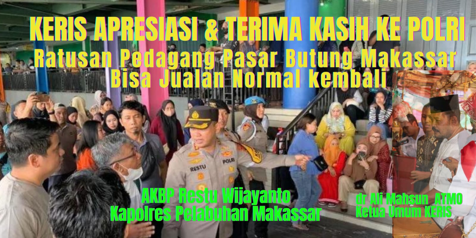 Bersama ini, selaku Ketua Umum Komite Ekonomi Rakyat Indonesia (Keris) dan Ketua Umum APKLI Perjuangan, menyampaikan apresiasi dan terima kasih kepada POLRI khususnya Kepada Kapolres Pelabuhan Makassar Sulsel AKBP Restu Wijayanto yang telah mengayomi dan melindungi para pedagang Pasar Butung dari intimidasi premanisme, serta berikan jaminan keamanan dan kenyamanan untuk berjualan kembali.