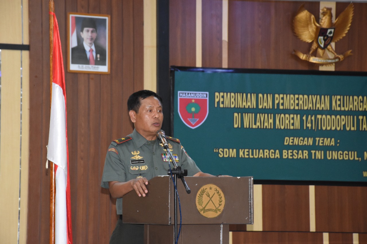 Dalam sambutannya Danrem 141/Tp mengatakan “Forum seperti ini juga bisa menjadi jembatan yang mampu menghilangkan sekat-sekat antara TNI AD khususnya Korem 141/Tp dengan Keluarga Besar TNI dan memperkokoh soliditas antar organisasi KB TNI agar tidak terbelah dengan prinsip silih asih, silih asah dan silih asuh.