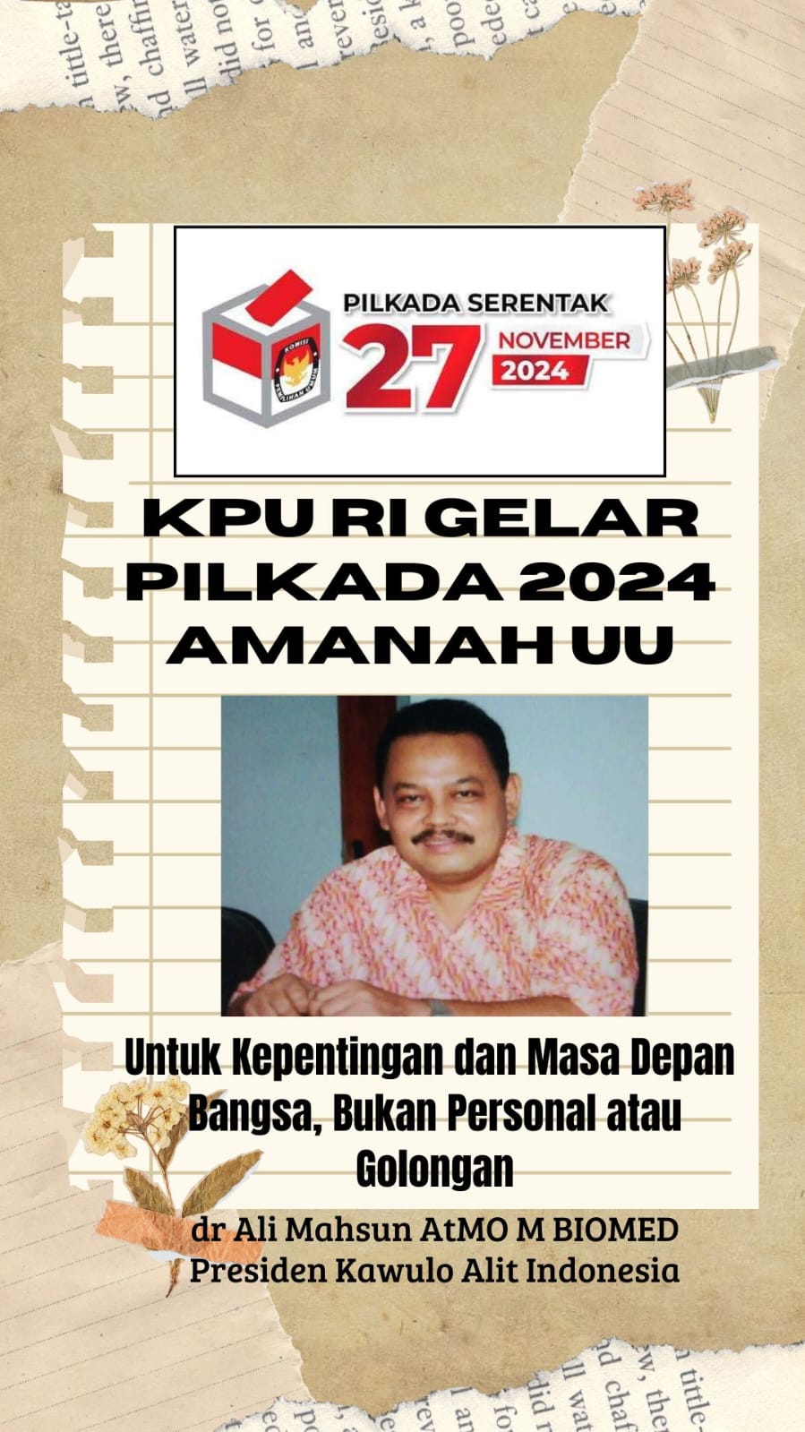 Jakarta-BERANDANKRINEWS.COM. Indonesia adalah negara hukum. KPU gelar Pilkada 27 November 2024 adalah amanah UU RI, bagian dari proses rekuitmen kepemimpinan bangsa, memilih dan menetapkan Gubernur, Bupati dan Walikota 2024-2029. Pilkada 2024 untuk kepentingan dan masa depan bangsa Indonesia, bukan untuk personal atau golongan. Oleh karena itu, tahapan Pilkada 2024 harus tetap berjalan, tak boleh terganggu oleh apa pun. Lebih dari itu, tak ada kaitan sama sekali dengan yang dialami mantan Ketua KPU RI Hasyim Asy’ari, tegas Presiden Kawulo Alit Indonesia (KAI), dr Ali Mahsun ATMO, M. Biomed, Jakarta, 9/7/2024.