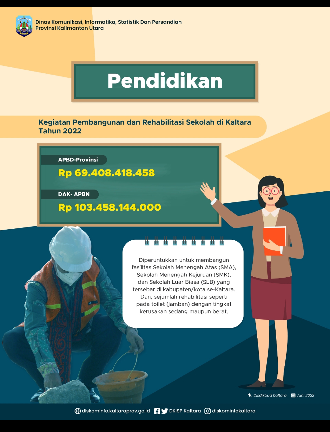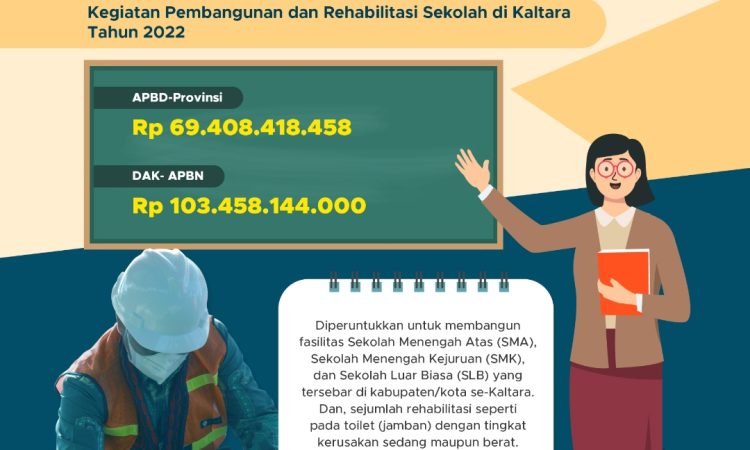 Kepala Dinas Pendidikan dan Kebudayaan (Disdikbud) Kaltara, Drs Teguh Henri Susanto, M.Pd melalui Sekretarisnya H Sudarsono mengungkapkan, selain melalui APBD Provinsi, pembangunan sekolah di Kaltara juga ditopang melalui Dana Alokasi Khusus (DAK) dari Anggaran Pendapatan dan Belanja Negara (APBN), nilainya Rp 103 miliar lebih.