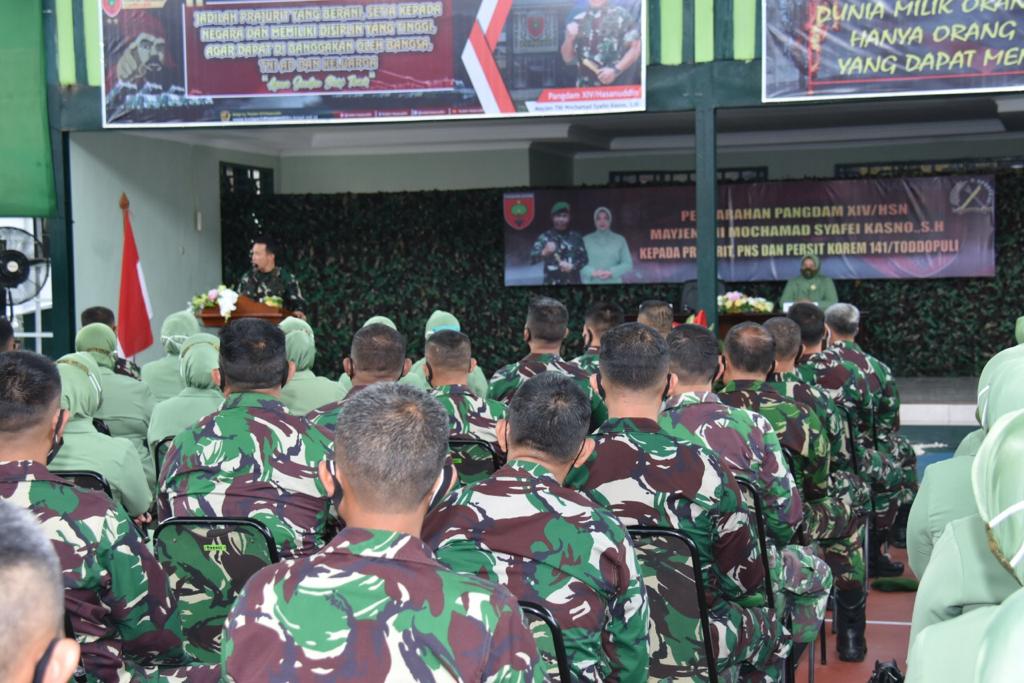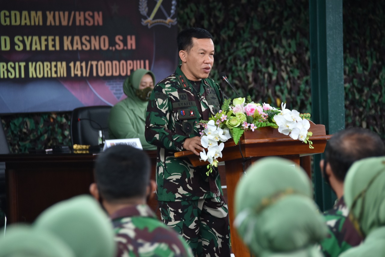 Watampone – Berandankrinews.com Mayjen TNI Mochamad Syafei Kasno S.H. (Pangdam XIV/Hsn) bersama Ny. Yuani Noor Indah Sri Aryani (Ketua Persit KCK PD Dam XIV/Hsn) beserta rombongan Kunjungan Kerja sekaligus berikan Pengarahan Kepada Personel Militer, PNS dan Persit KCK Koorcab Rem 141/Tp. Dan disambut langsung oleh Danrem 141/Tp. Brigjen TNI Djashar Djamil, S.E M.M Bertempat di Makorem 141/Tp. Jln. Jl Sudirman No.9 Watampone. 06/05/2021