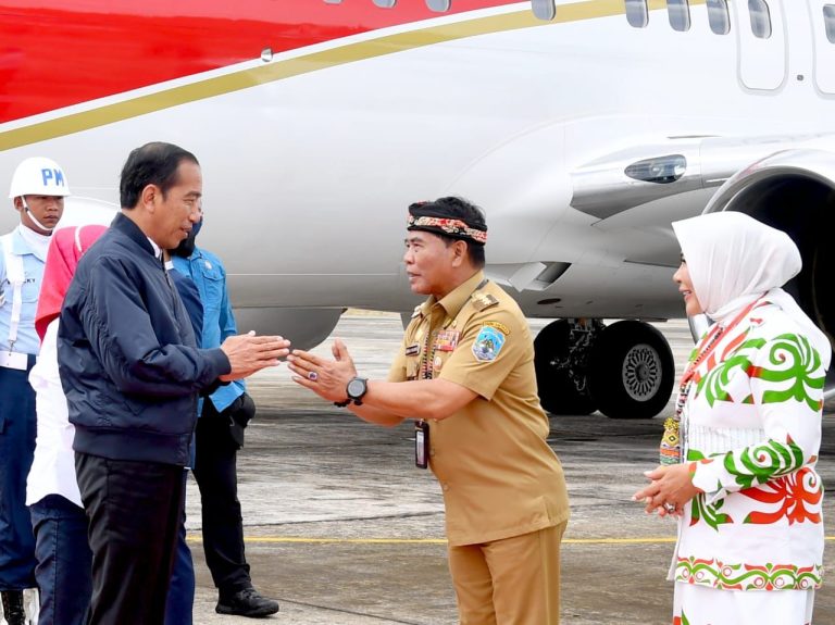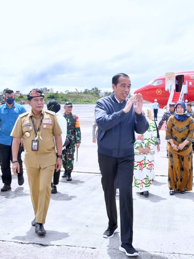 TARAKAN – Presiden Joko Widodo dan Ibu Iriana Joko Widodo tiba di Pangkalan TNI AU Anang Busra, Kota Tarakan, Provinsi Kalimantan Utara (Kaltara), pada Selasa, 28 Februari 2023, sekitar pukul 11.00 WITA. Kedatangan Presiden dan Ibu Iriana disambut oleh Gubernur Kalimantan Utara Zainal Arifin Paliwang dan istri, Pangdam VI/Mulawarman Mayjen TNI Tri Budi Utomo dan istri, Kapolda Kalimantan Utara Irjen Pol. Daniel Adityajaya dan istri, Danlanud Anang Busra Kolonel Pnb. Bambang Sudewo dan istri, serta Danlantamal XIII Tarakan, Laksma TNI Deni Herman dan istri.