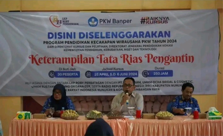 NUNUKAN- Mewakili Bupati Nunukan Hj. Asmin Laura Hafid, Kepala Dinas Pendidikan Kabupaten Nunukan Akhmad menghadiri sekaligus membuka Program Pendidikan Kecakapan Wirausaha (PKW) tahun 2024 yang diselenggarakan oleh lembaga kursus dan pelatihan Roby Perbatasan Kabupaten Nunukan di Gedung Darma Wanita Persatuan, Kamis (25/04).