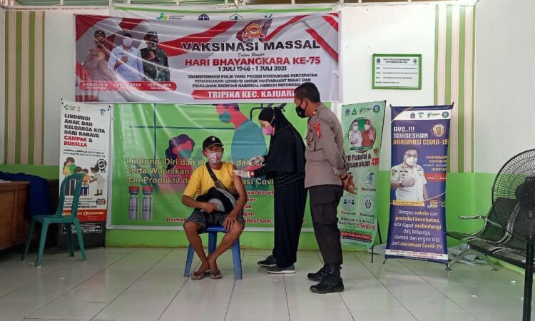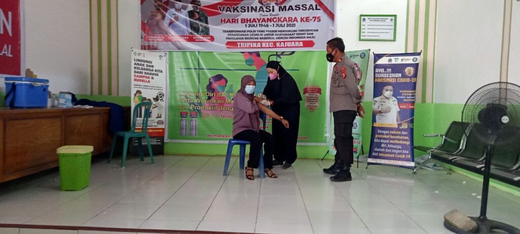 Seperti terlihat pada pelaksanaan vaksinasi di Puskesmas Kajuara, (16/07/2021), Wakapolsek Kajuara memantau pelaksanaan vaksinasi dosis pertama terhadap warga masyarakat Kecamatan Kajuara dan yang melakukan vaksinasi adalah koordinator vaksinasi Puskesmas Kajuara Baharuddin, S.Kep.