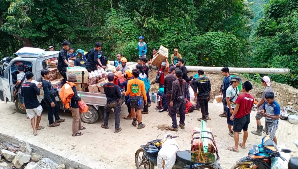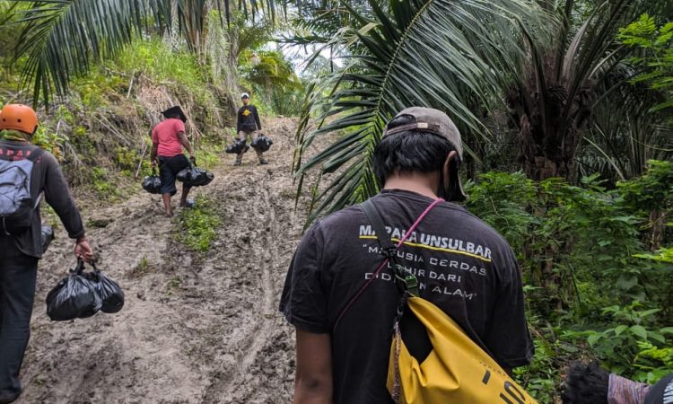 Mapala unsulbar Dan Tim Relawan melewati kurang lebih 1km perjalanan ke dusun aholeang Desa Mekttta kec. Malunda dengan kondisi jalan Berlumpur Dan melewati Lereng2 pegunungan yang Sewaktu Waktu bisa saja terjadi Longsor pungkas”Gusman Ketua umum mapala Unsulbar saat ditemui di Posko induk , Jumat malam ,22-01-2021