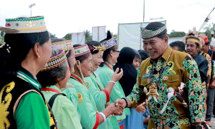Kedatangan Gubernur disambut dengan tumpah ruahnya masyarakat hingga memenuhi jalan menuju Balai Adat dengan menggelar parade dan iringan tarian.