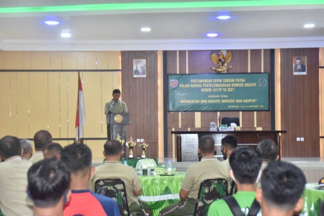 Watampone -Berandankrinews.com Pembukaan Kegiatan Pertandingan Sepak Takraw Putra Dalam Rangka Penyelenggaraan Komsos Kreatif Korem 141/Tp TA 2021 dengan tema “Membentuk SDM Kreatif Inovatif dan Adaptif” dibuka oleh Danrem 141/Tp yang diwakili oleh Kasrem 141/Tp. Kolonel Arh Elphis Rudy, S.E., M.M.,M.Sc., M.S.S, bertempat di Aula Sudirman Makorem 141/Tp Jln Jend. Sudirman, Kel. Manurunge, Kec. Tanete Riattang, Kab. Bone. Selasa 16/11/2021