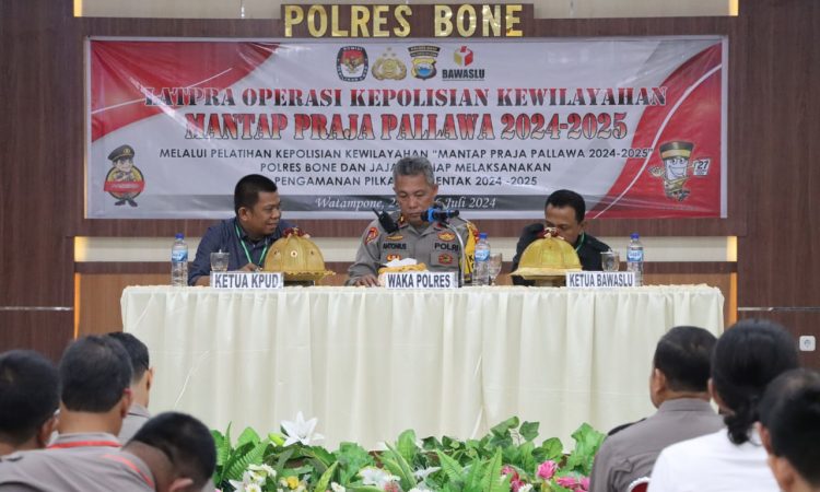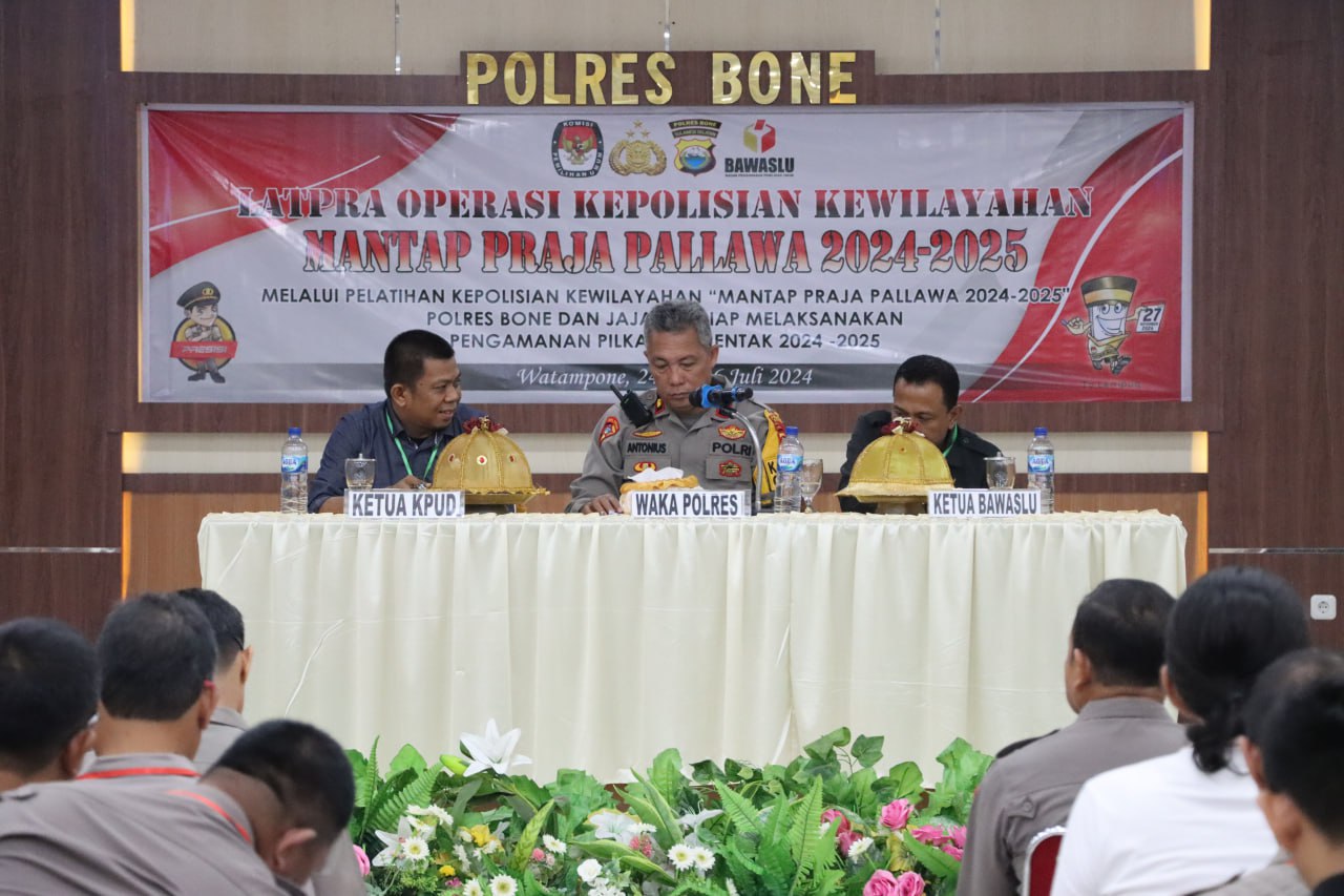 Dalam rangka persiapan Operasi Mantap Praja Pallawa 2024-2025 untuk mengamankan Pilkada Serentak, Polres Bone menggelar Latihan Pra Operasi (Latpra) selama tiga hari mulai tanggal 23 hingga 25 Juli 2024 di Aula Sarja Araya Racana, Mapolres Bone. Kegiatan ini dibuka langsung oleh Plt. Wakapolres Bone, Kompol Antonius Tutleta, S.Pd., dan dihadiri oleh para pejabat utama, kapolsek jajaran, serta seluruh personel yang terlibat dalam operasi. Selasa, 23/7/2024