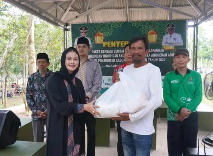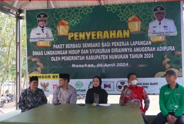 NUNUKAN- Bupati Nunukan Hj. Asmin Laura Hafid membagikan paket sembako atau bingkisan lebaran buat pekerja lapangan Dinas Lingkungan Hidup Kabupaten Nunukan serta syukuran diraihnya anugerah Adipura oleh Pemerintah Kabupaten Nunukan. Kegiatan tersebut berlangsung di Hutan Kota Nunukan Selatan, Jumat (05/04).