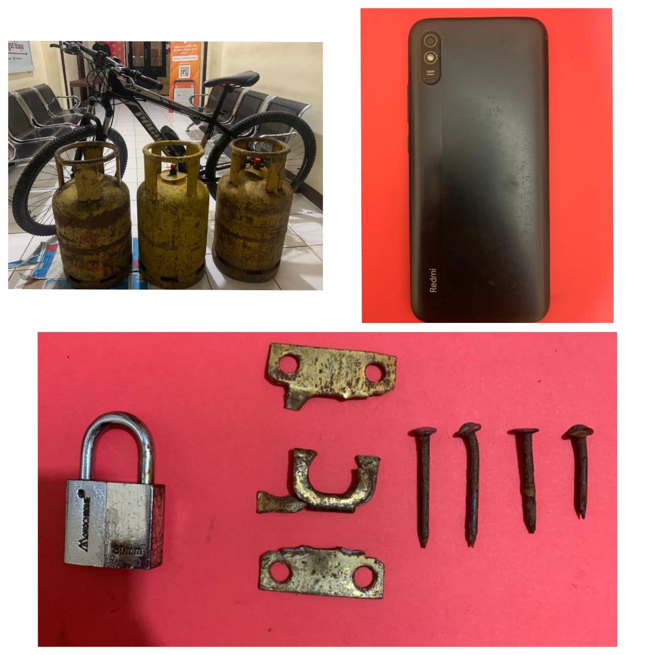 Setelah dilakukan penyelidikan lebib lanjut, ditemukan barang bukti diantaranya 3 Buah tong gas 14 kg warna kuning, 1 unit handphone merk “Redmi” warna hitam, 1 Unit sepeda merk “Pacifik” warna hitam, 1 buah gembok dan patahan grendel pintu.