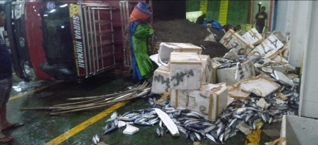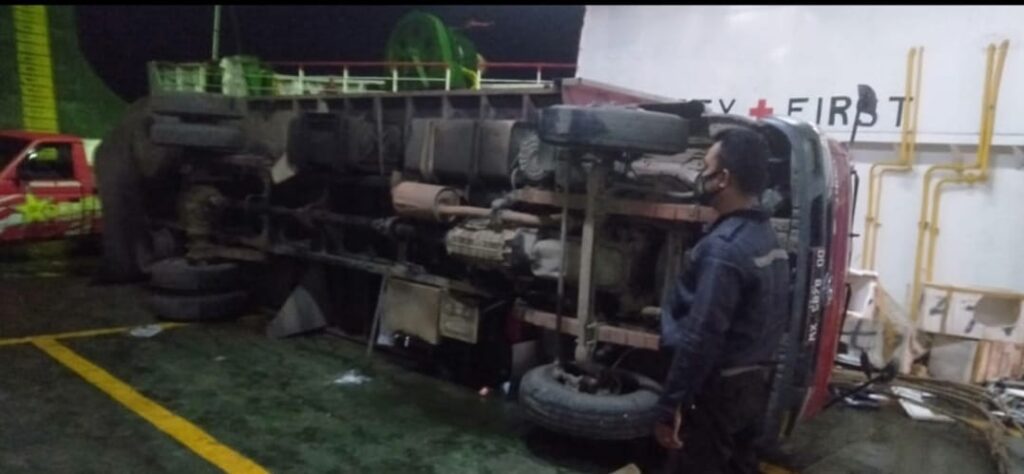 BONE,Berandankrinews.com. Akhir akhir ini cuaca buruk melanda di teluk bone, Akibat cuaca buruk ini, terjadi kecelakaan laut di lintasan penyeberangan Kolaka – Bajoe. Gelombang tinggi dan angin kencang mengakibatkan sebuah truk berukuran sedang (TS) yang bermuatan cankang kelapa sawit dan ikan dalam gabus terbalik di atas KMP. Kota Muna milik PT Yuli Rahayu. Jumat (28/5/2021).