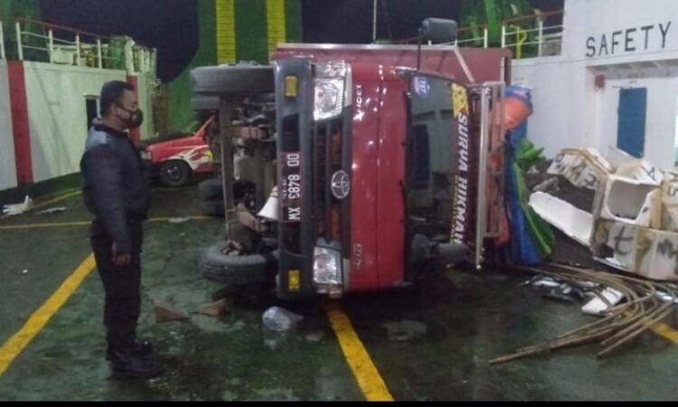 Truk berukuran sedang ini terbalik akibat tali lashing-nya putus, karena tak kuat menahan beban yang dihempaskan gelombang di teluk bone akibatnya, truk mengalami kerusakan pada dinding dan kaca depan pecah.