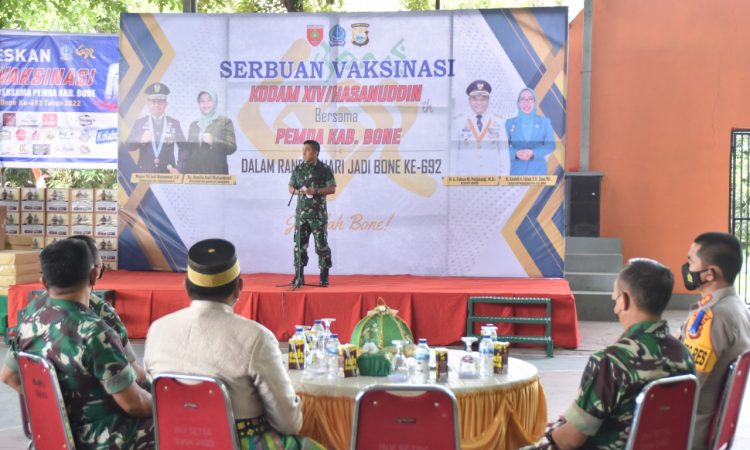Dalam sambutannya pangdam XIV/Hsn mengatakan, “Kegiatan serbuan Vaksinasi yang dilaksanakan ini atas kerjasama Kodam XIV/Hasanuddin dengan Kabupaten Bone tentunya dengan forum koordinasi pimpinan daerah dalam rangka hari jadi Kabupaten Bone yang Ke-692 tahun 2022. “Tuturnya.
