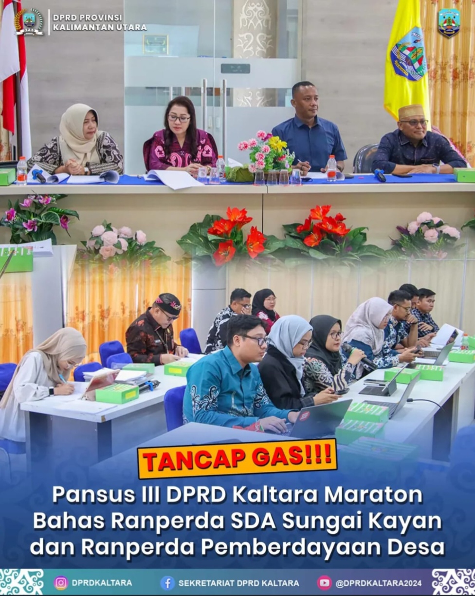 TARAKAN – Pansus III DPRD Provinsi Kalimantan Utara tengah mengakselerasi penyusunan dua regulasi strategis sekaligus melalui rapat kerja maraton yang membedah secara mendalam Rancangan Peraturan Daerah (Ranperda) tentang Tata Cara Perizinan Pengusahaan dan Persetujuan Penggunaan Sumber Daya Air di Wilayah Sungai Kayan, serta Ranperda tentang Pemberdayaan Masyarakat Desa, pada Kamis (09/04/26).