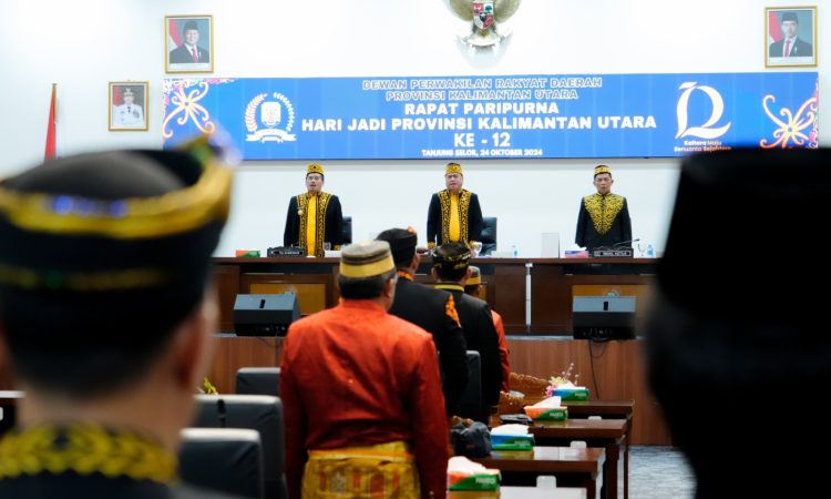 TANJUNG SELOR – Pjs. Gubernur Kalimantan Utara (Kaltara), Togap Simangunsong hadir langsung pada Rapat Paripurna dalam rangka Hari Jadi Provinsi Kalimantan Utara ke 12 di ruang rapat paripurna Dewan Perwakilan Rakyat Daerah (DPRD) Provinsi Kaltara, Kamis (24/10).