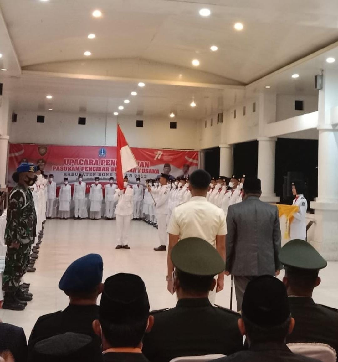 Sebanyak 70 anggota Pasukan Pengibar Bendera (Paskibra) Merah Putih yang akan bertugas pada upacara peringatan HUT Ke-77 RI di Kabupaten Bone, dikukuhkan pada hari Jumat 12 Agustus 2022. Pengukuhan Paskibra tersebut dilakukan oleh Bupati Bone Dr.H.A.Fahsar M. Padjalangi,M.Si. di tribun Lapangan Merdeka, Watampone.