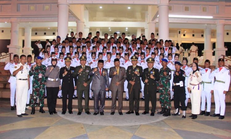 Watampone -Berandankrinews.com. Kasrem 141/Toddopuli. Muhammad Arif Suryandaru dan Dandenpom XIV/1. Mayor Cpm Azis Hamdani,S.H.,M.Hum menghadiri Upacara Pengukuhan Pasukan Pengibar Bendera Pusaka (Paskibraka) Kab.Bone tahun 2022, di Tribun Lapangan Merdeka Kota Watampone. Jumat 12/08/2022.