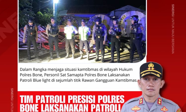 BONE -Berandankrinews.com. Dalam rangka mengantisipasi terjadinya gangguan keamanan dan ketertiban masyarakat (kamtibmas), Anggota Patroli Perintis Presisi Sat Samapta Polres Bone melaksanakan Patroli Blue Light. Kamis (25/07/2024) Malam.