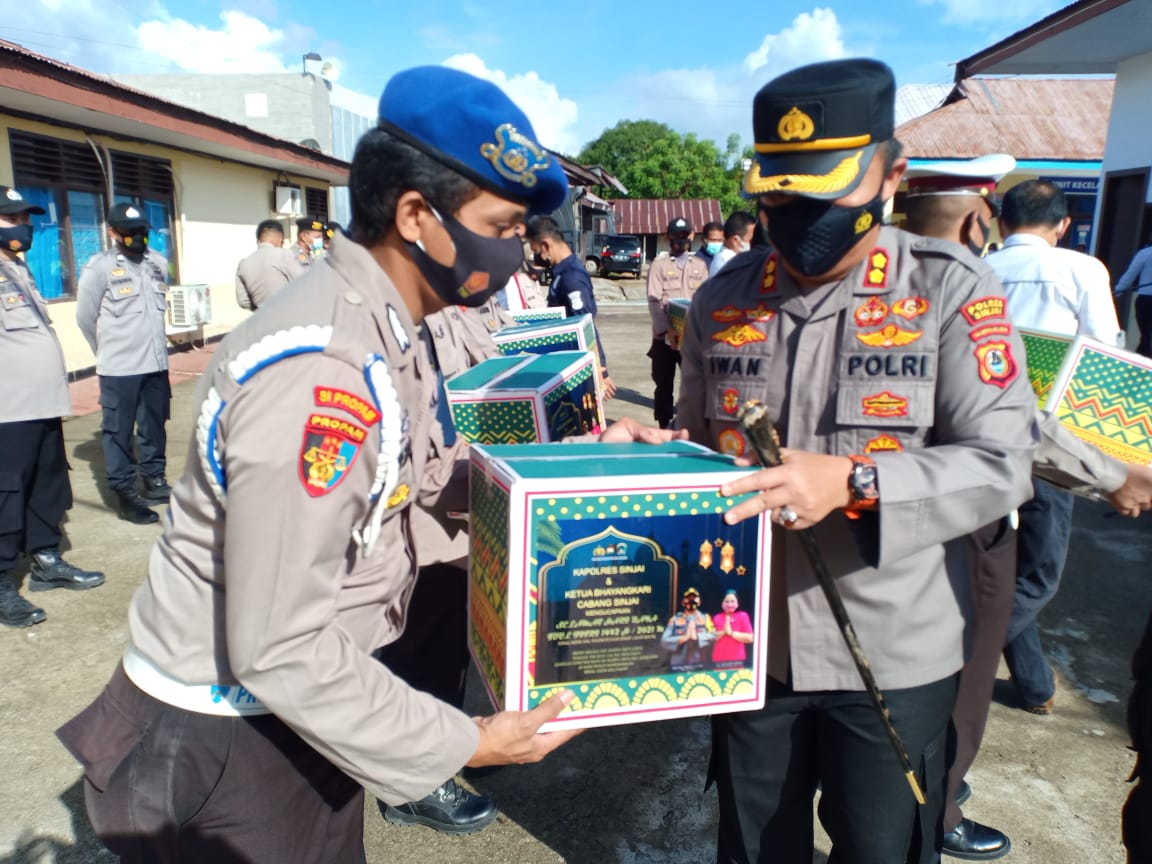 Sinjai –Berandankrinews.com Selesai pimpin apel pagi Kapolres Sinjai, Akbp Iwan Irmawan, S.Ik.,M.Si secara simbolis menyalurkan bingkisan paket hari raya Idul fitri 1442 H kepada personil Polres Sinjai, Senin (03/5/2021) pagi.