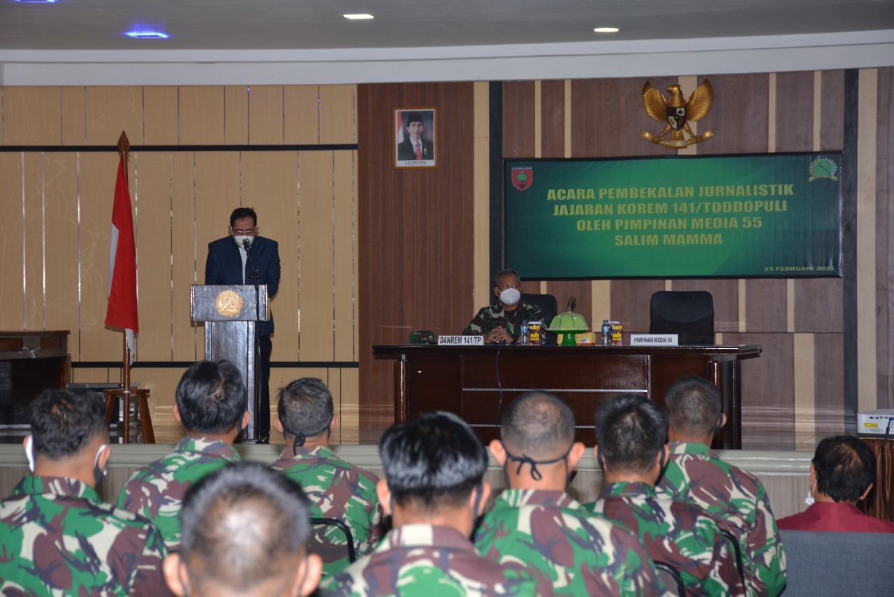 Adapun Sambutan Pimpinan Media 55 Salim Mamma yang Intinya: Saya ucapkan terima kasih Kepada Komandan Korem 141/Tp beserta Staf dan Jajaran Korem 141/Tp. Sehingga acara pembekalan jurnalistik ini terlaksana dengan lancar. “Ucapnya