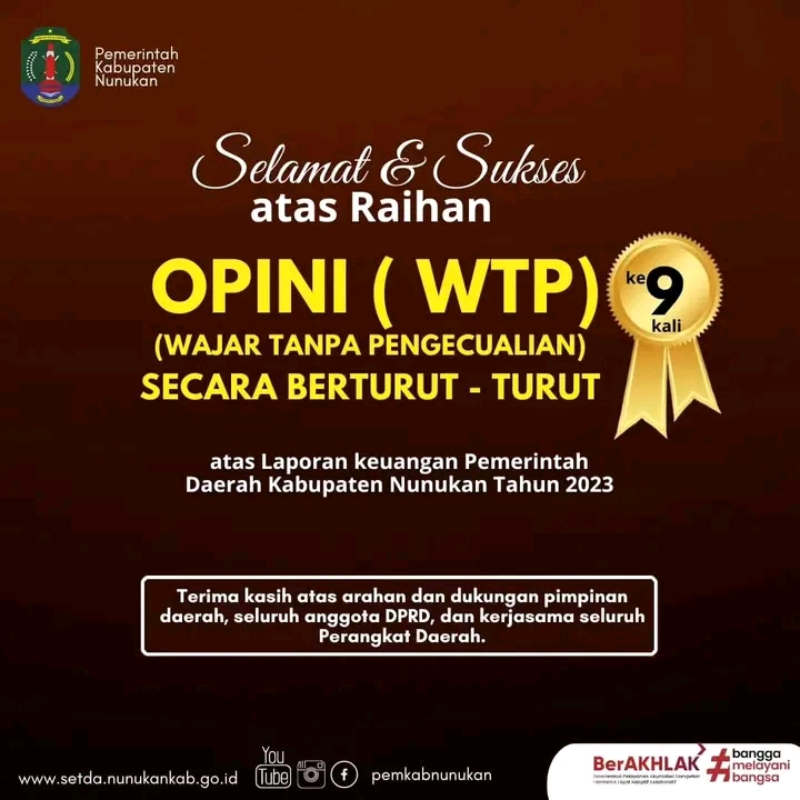 NUNUKAN – Pemerintah Kabupaten Nunukan meraih opini Wajar Tanpa Pengecualian (WTP) ke-9 dari Badan Pemeriksa Keuangan (BPK) RI Perwakilan Kalimantan Utara. predikat WTP ke 9 ini terkait laporan keuangan tahun 2023. Pengumuman raihan WTP itu disampaikan dalam acara penyerahan LHP atas LKPD Pemerintah Kabupaten Nunukan TA 2023 yang berlangsung di Ruang Auditorium Kaltara, Kamis 30 Mei 2024.