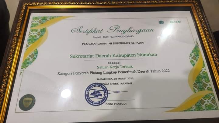 Penghargaan Anugerah Reksa Bandha yang diperoleh Kabupaten Nunukan karena dinilai sebagai Satuan Kerja Terbaik dengan Kategori Penyerah Piutang Terbaik Lingkup Pemerintah Daerah.