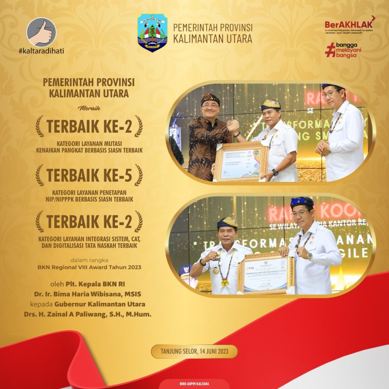 TANJUNG SELOR – Dalam Rapat Koordinasi Kepegawaian Se-Wilayah Kerja Kantor Regional VIII BKN yang digelar Rabu, 14 Juni 2023 di Ruang Serbaguna Lt.1 Gedung Gadis Kaltara, Kanreg VIII BKN memberikan penghargaan ‘Terbaik 2’ kepada Pemerintah Kalimantan Utara dengan kategori Layanan Mutasi Kenaikan Pangkat Berbasis SIASN Terbaik, ‘Terbaik 5’ dengan kategori Layanan Penetapan NIP/NIPPPK Berbasis SIASN Terbaik, dan ‘Terbaik 2’ Layanan Integrasi Sistem, CAT dan Digitalisasi Tata Naskah Terbaik yang diserahkan Kepala Kantor Regional VIII BKN Banjarmasin, A. Darmuji.