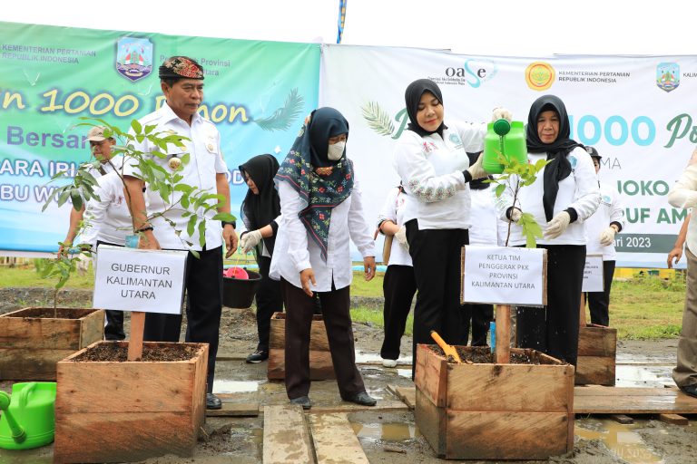 BULUNGAN – Gubernur Kaltara Drs. H. Zainal A Paliwang, S.H., M.Hum bersama Ketua TP-PKK Kaltara Hj. Rachmawati Zainal A Paliwang melakukan Penanaman 1000 Pohon Bersama Ibu Negara Iriana Joko Widodo, Ibu Wury Ma’ruf Amin, serta Organisasi Aksi Solidaritas Era Kabinet Indonesia Maju (OASES KIM), Rabu 1 Februari 2023.