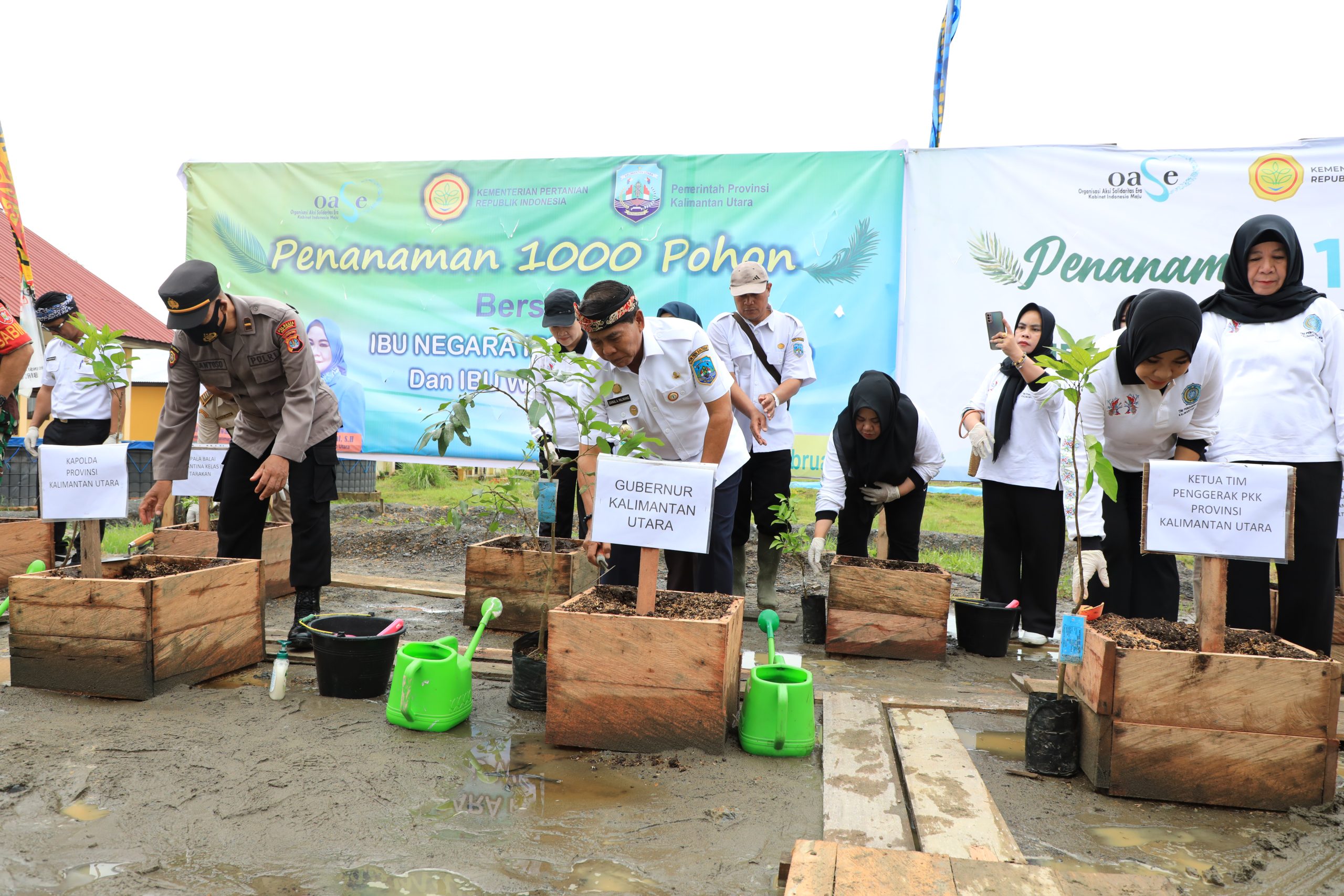 BULUNGAN – Gubernur Kaltara Drs. H. Zainal A Paliwang, S.H., M.Hum bersama Ketua TP-PKK Kaltara Hj. Rachmawati Zainal A Paliwang melakukan Penanaman 1000 Pohon Bersama Ibu Negara Iriana Joko Widodo, Ibu Wury Ma’ruf Amin, serta Organisasi Aksi Solidaritas Era Kabinet Indonesia Maju (OASES KIM), Rabu 1 Februari 2023.