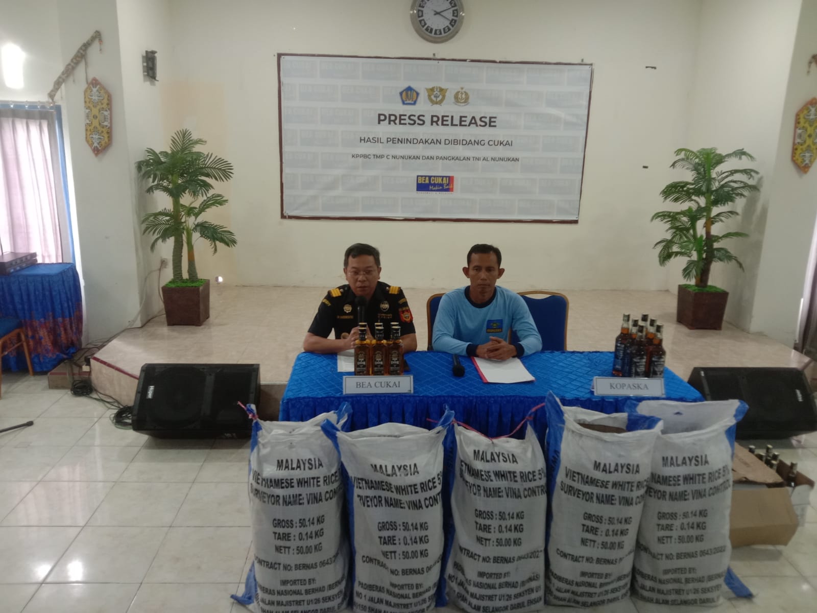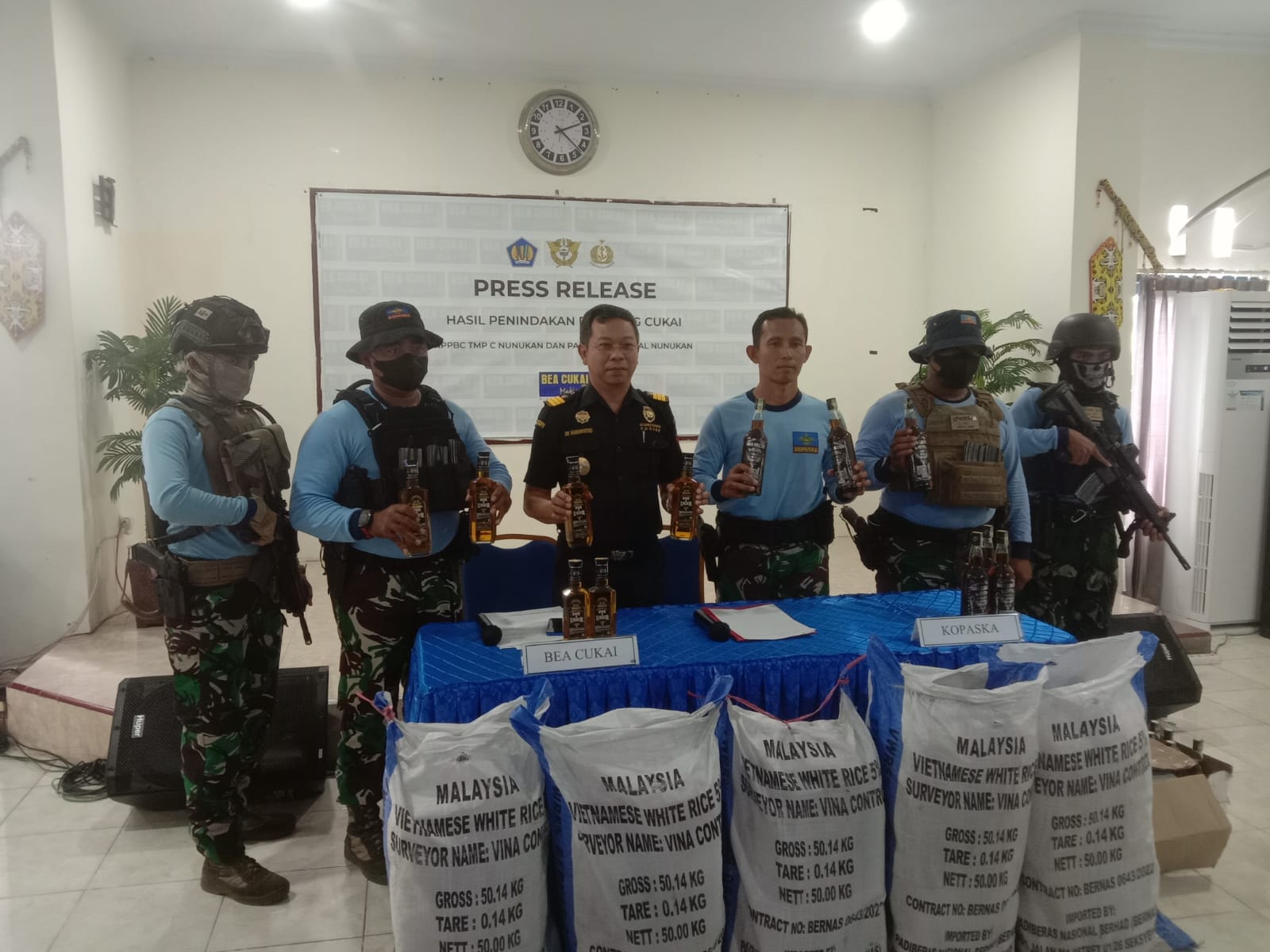 NUNUKAN – Bertempat di Kantor Pengawasan dan Pelayanan Bea dan Cukai Tipe Madya Pabean (KPPBC TMP) C Nunukan Pukul 14.00 WITA, Bea Cukai gelar siaran pers serah terima barang tegahan berupa Minuman Mengandung Etil Alkohol (MMEA) ilegal dari hasil penindakan Komando Pasukan Katak (KOPASKA) XVII di bawah kendali Operasi (BKO) Guspurla Koarmada II dalam Operasi Gabungan “Karang Baruna-23”, Kamis (02/03/2023).