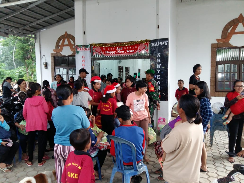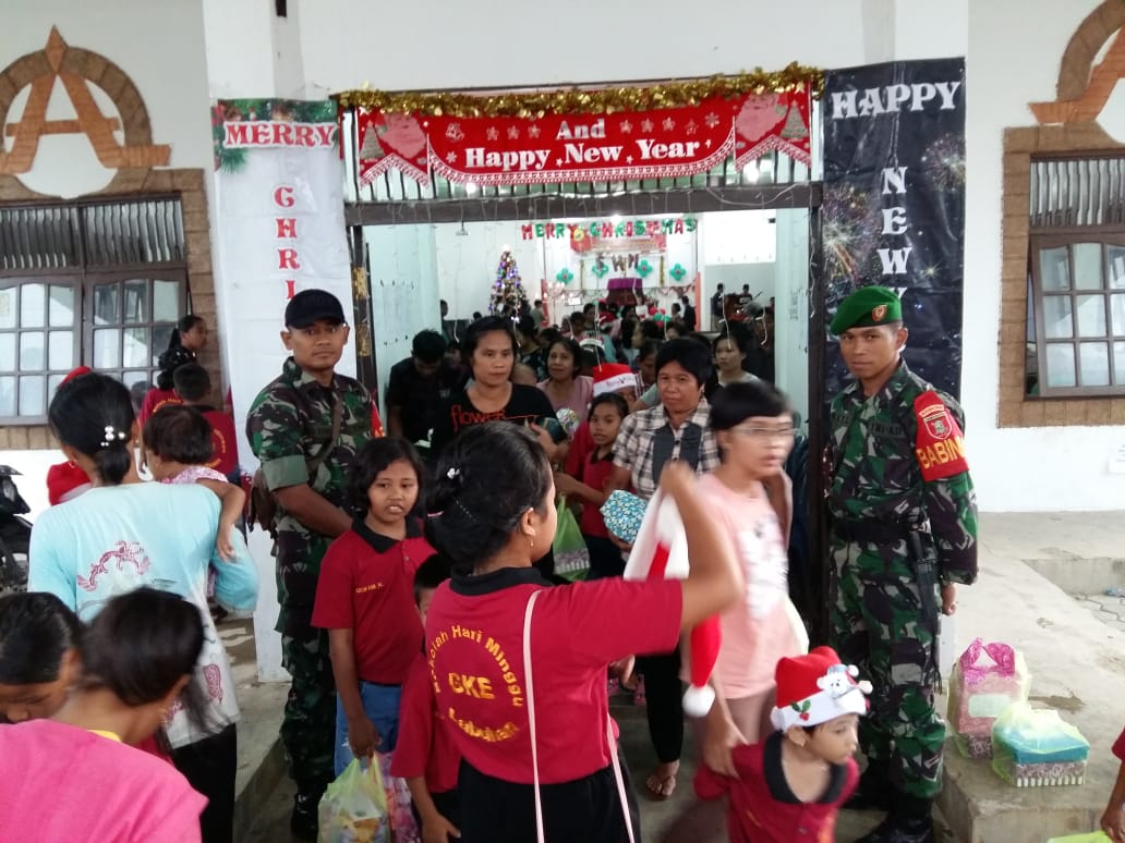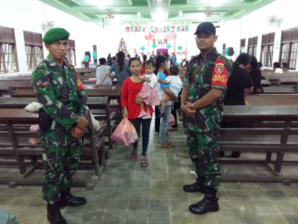 Anggota Koramil 1002-01/Birayang Serda Agus Rohmad dan Kopda Erly Serta satu orang anggota Unit Inteldim 1002/Barabai Sertu Erwanto melaksanakan pengamanan Ibadah Perayaan Natal Seksi Pelayanan Anak Sekolah Hari Minggu Umat Kristen Protestan di Gereja Kalimantan Evangelis EPHATA Desa Labuhan RT.02 RW.01 Kec.Batang Alai Selatan Kab. Hulu Sungai Tengah,
