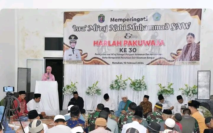 NUNUKAN- Ungkapan tersebut Bupati Nunukan Hj Asmin Laura Hafid sampaikan pada saat menghadiri Isra’ Mi’raj yang dilaksanakan oleh Pakuwaja Kabupaten Nunukan yang dirangkaikan dengan Hari Lahir (Harlah) yang ke 30 Tahun di Pendopo Pakuwaja di Jalan Bukit Cinta Nunukan.