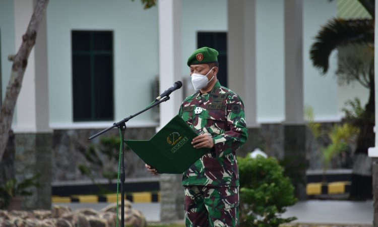 Watampone-Berandankrinews.com Personel Korem 141/Toddopuli Balakrem Beserta Pns Korem melaksanakan Upacara Bendera dengan tetap mengikuti proyokol kesehatan bertempat di lapangan Apel Makorem 141/Toddopuli Jl. Jendral sudirman No. 9 Watampone Dengan Irup Kasi Pers Kasrem 141/Toddopuli Letkol Arm Yani Ari Sasongko(18).