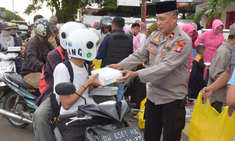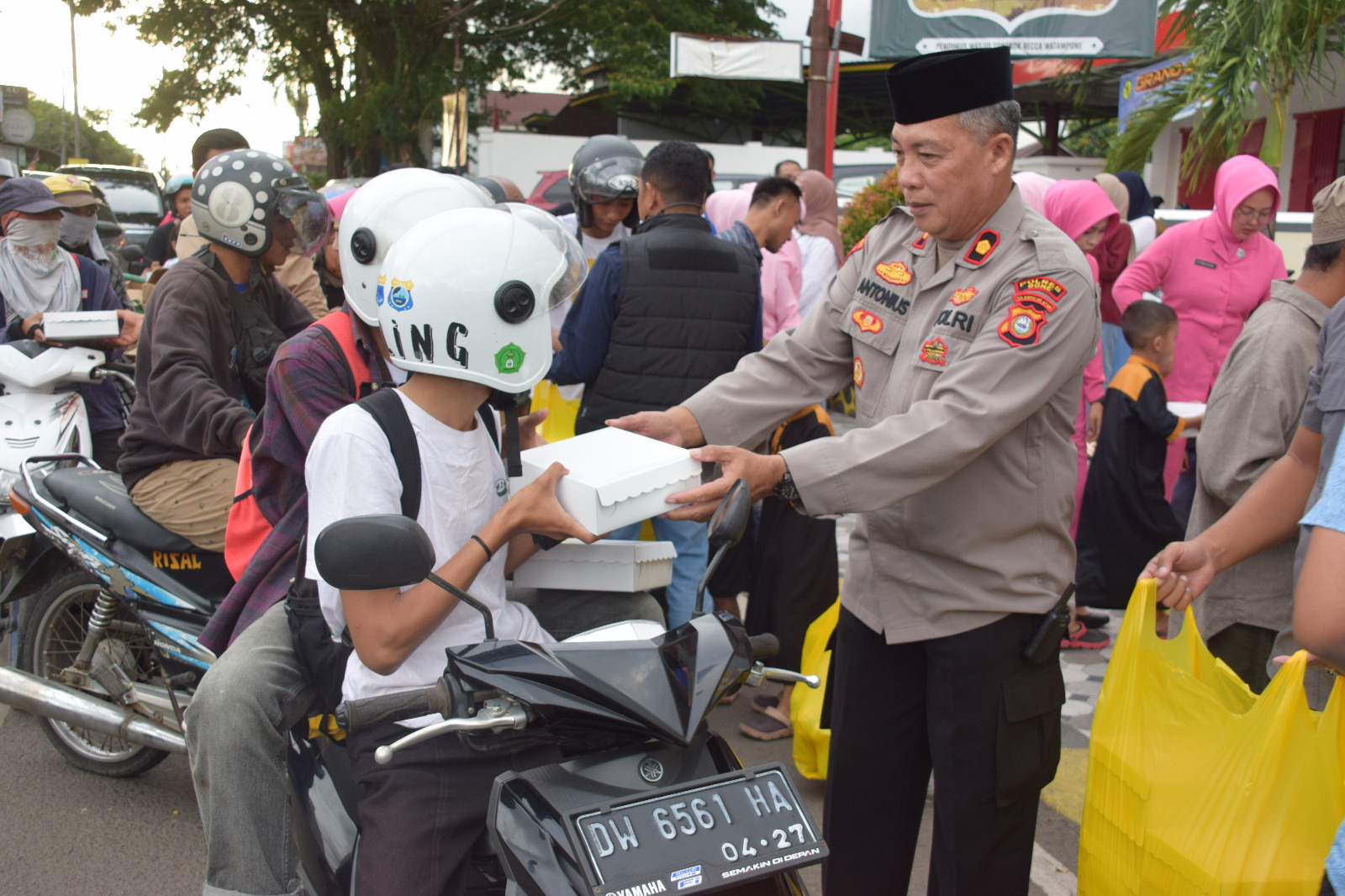 Pembagian takjil dilakukan di depan Masjid Songkok Recca, Kota Watampone. Para pengendara yang melintas di Jalan Achmad Yani mendapatkan paket takjil sebagai bentuk kepedulian dan kebersamaan dalam menyemarakkan bulan penuh berkah ini. Turut hadir dalam kegiatan ini Kasat Reskrim AKP Yusriadi Yusuf, Plt Kasihumas Iptu Rayendra Muchtar, serta para perwira lainnya.