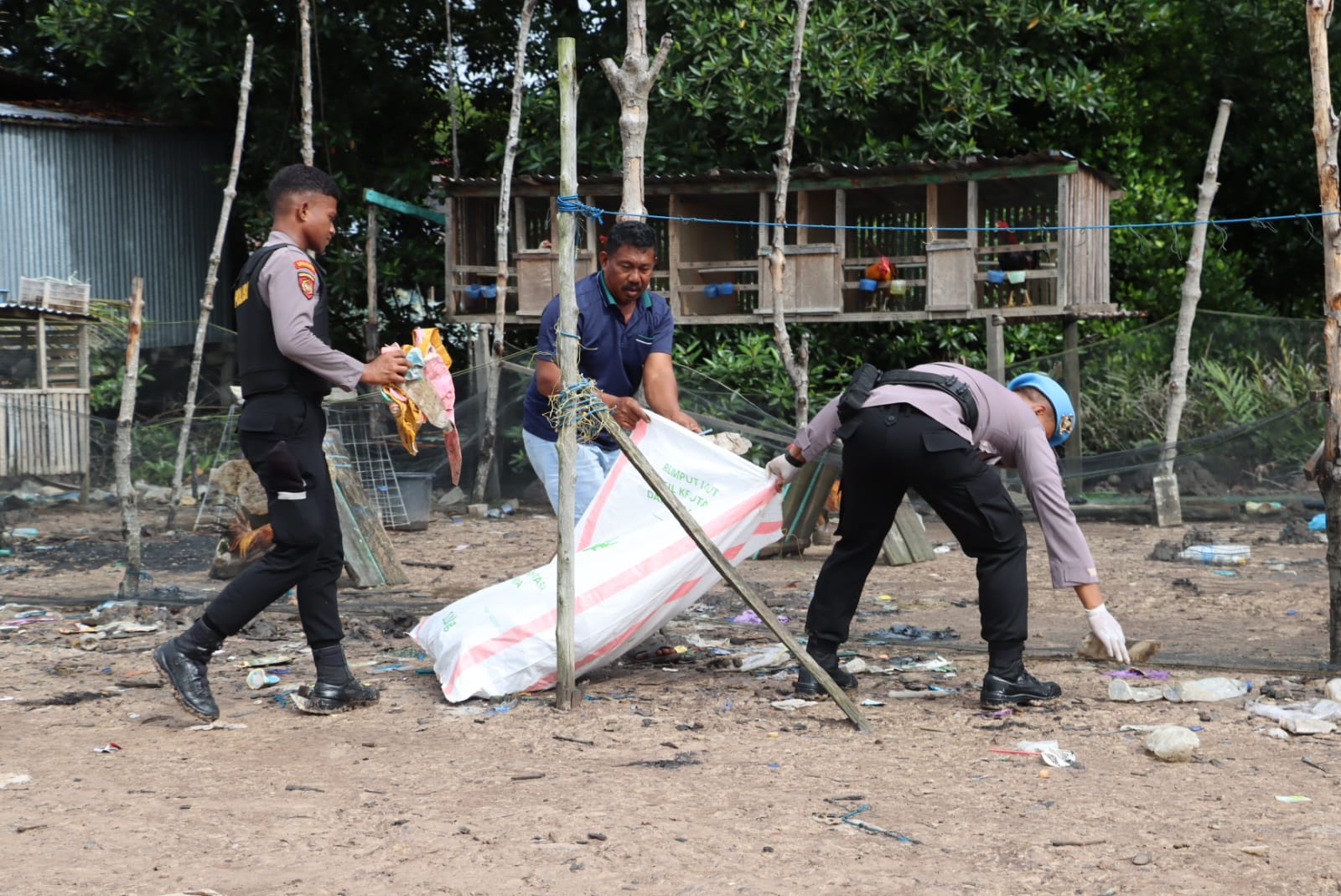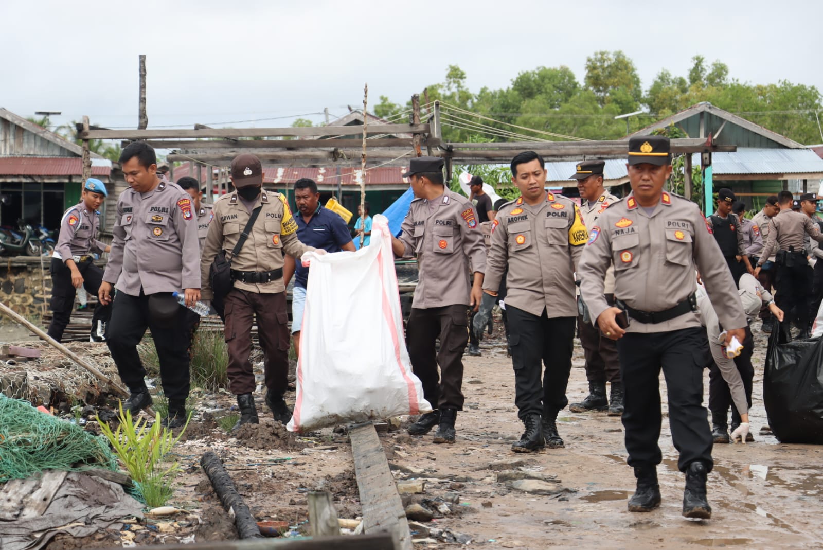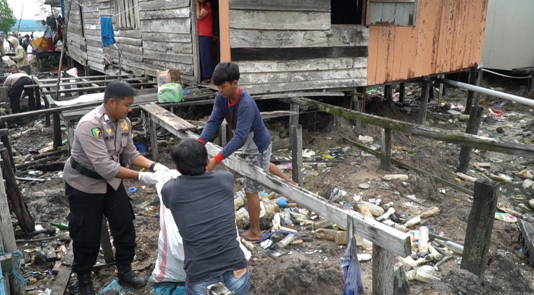 Sekitar 200 orang personel Polres dan Polsek, bersama masyarakat melaksanakan bersih-bersih sampah baik dikolong rumah maupun tepi pantai yang ada di lingkungan Kampung Nelayan