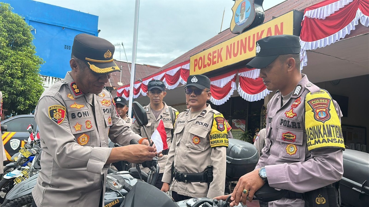 Di depan Mako Polsek Nunukan, kegiatan dipimpin langsung Kapolres Nunukan AKBP Bonifasius Rumbewas, S.I.K bersama Pejabat Utama Polres Nunukan. Sebanyak 100 Bendera Merah Putih dibagikan dan dipasang kepada pengendara roda dua yang melintas serta pada motor dinas personel Polsek Nunukan.