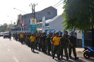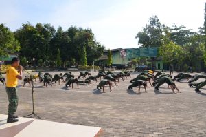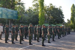 WATAMPONE – Apel pagi dalam rangka kegiatan minggu militer di Lapangan Makorem 141/Tp Jalan Jendral Sudirman No.09 Watampone dengan Perwira Pengawas Kasi Ops korem141/Tp. Letkol Inf Apriadi Nidjo. Selasa (26/11/2019).