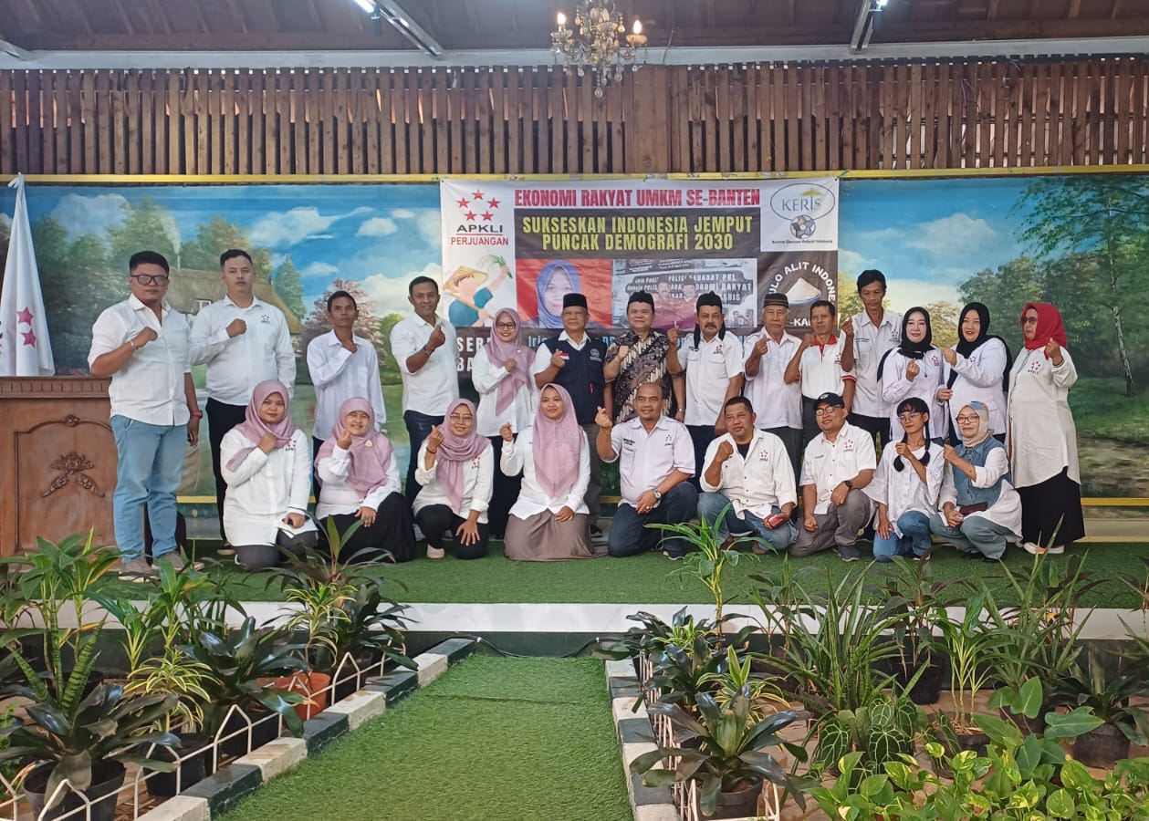 Banten,-Berandankrinews.com. Tekad Bulat Pelaku Ekonomi Rakyat UMKM Se-Banten Sukseskan Indonesia Jemput Puncak Bonus Demografi 2030 digelar oleh Komite Ekonomi Rakyat Indonesia (KERIS), APKLI-P dan Kawulo Alit Indonesia (KAI) di RM Pokel Garden Serang Banten, Kamis, 20/6/2024. Pada kesempatan yang sama, kepengurusan DPW APKLI-P Provinsi Banten periode 2024-2029 yang diketuai Ir Rika Rahmawati ST MT resmi dilantik Ketua Umum dihadapan Irjen Pol Pur DR Ronny F Sompie, SH MH, Ketua Wanbin KERIS, Laksamana Pertama TNI Pur DR Ir Eden Gunawan, Ketua ICMI Banten, BI Banten, Ketua DPD APKLI-P dari 8 Kab dan Kota Se-Banten beserta jajaran, dan pelaku ekonomi rakyat UMKM.