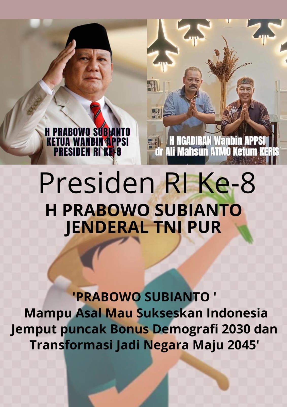 Saya yakin beliau mau dan mampu sukses kan Indonesia menjemput puncak bonus demografi 2030 dan transformasi jadi negara maju 2045. Bismillaah Pak dokter, Insya Allah saya sampaikan salam hormat, doa dan dukungannya kepada beliau, tutur tokoh bangsa asal Gunungkidul Yogyakarta H Ngadiran, Sekjen APPSI 2004-2015 yang pernah dampingi Ketua Umum APPSI, H Prabowo Subianto selama 8 tahun 2008-2015.